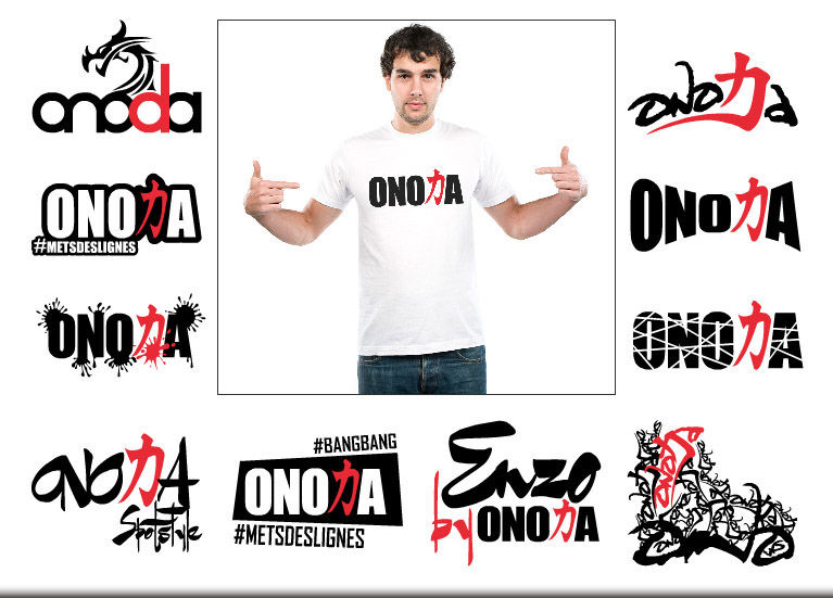 Depuis 2015, j'interviens en tant que directeur artistique pour la marque ONODA qui distribue du prêt à porter et du matériel de roller freestyle. Voici quelques déclinaisons réalisées à partir du logo original (au centre).